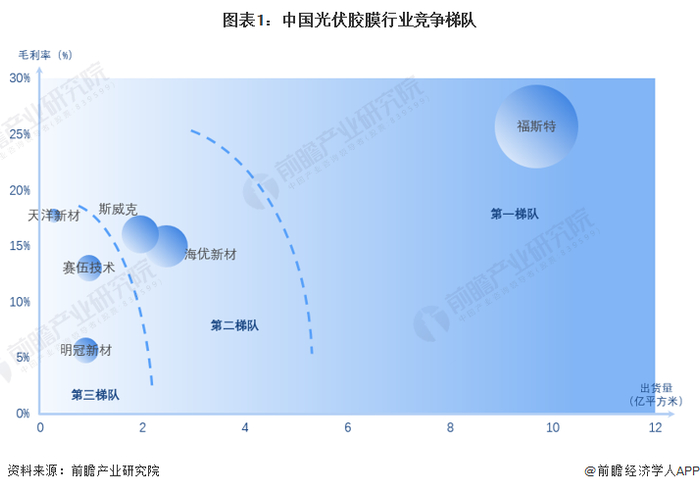 中国光伏胶膜市场主要可以分为三个竞争梯队,第一梯队的企业是福斯特,是光伏胶膜领域的龙头企业;处于第二梯队的是海优新材、斯威克,正逐渐追赶行业头部;第三梯度包括天洋新材、明冠新材、赛务技术等。