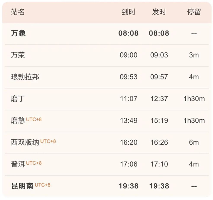 中老铁路国际旅客列车时刻表