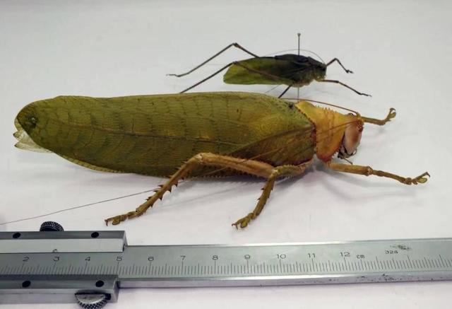 4月23日,成都华希昆虫博物馆馆长赵力告诉记者,巨拟叶螽在国内主要分布于云南省西双版纳等地,在广东省也有发现;在国外则广泛分布于泰国、缅甸、越南等地,“和我们平时常见的蝈蝈不一样,喜欢在树顶的浓密枝叶里躲藏,晚上雄性发出叫声求偶。”