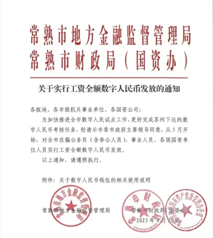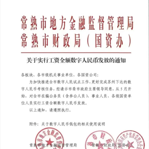 4月22日,据上海证券报消息,常熟市地方金融监督管理局和常熟市财政局日前印发《关于实行工资全额数字人民币发放的通知》。该通知称,从5月开始对常熟市在编公务员(含参公人员)、事业人员、各级国资单位人员实行工资全额数字人民币发放。