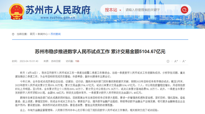 日前,苏州召开数字人民币试点工作一季度总结暨二季度工作推进会,截至3月末,2023年数字人民币试点累计交易809.80万笔,累计交易金额1704.67亿元,试点以来累计交易金额5104.67亿元。