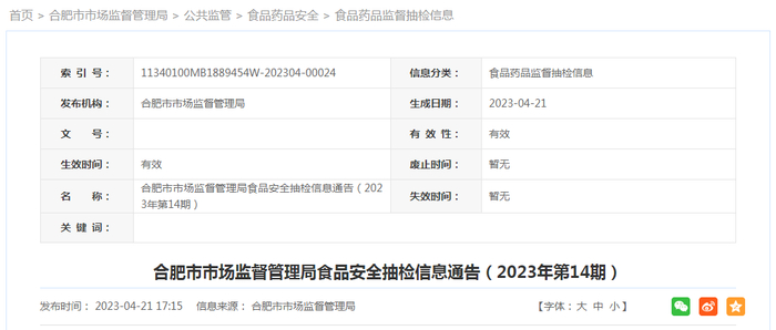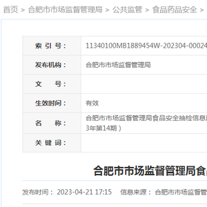 合肥市市场监督管理局发布2023年第14期食品安全抽检信息
