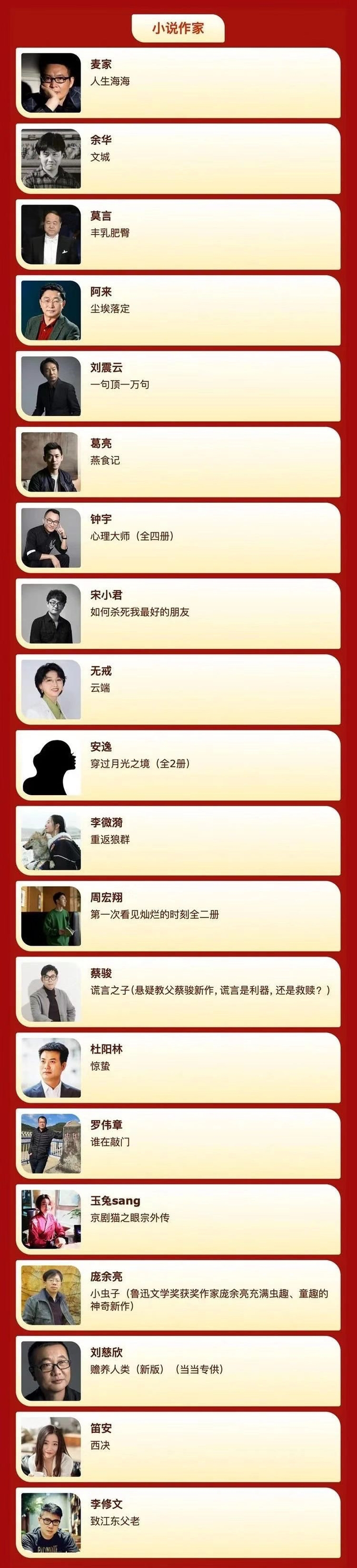 “小说作家”名单中,莫言、余华、刘震云、葛亮、刘慈欣、笛安、李修文等文学名家均在列。阿来、杜阳林、罗伟章3位四川作家,凭借各自的长篇代表作《尘埃落定》《惊蛰》《谁在敲门》入选。其中,因为《惊蛰》的热销,这是杜阳林第二次入选,去年,他是第八届当当影响力作家“小说作家”中唯一入选的四川作家。