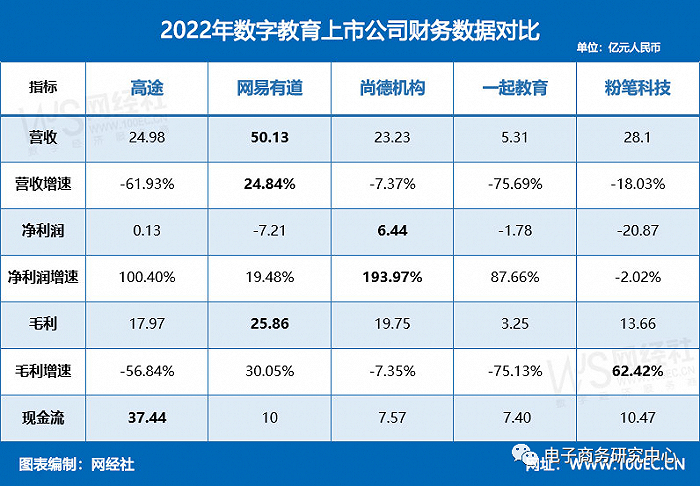 近期,众多数字教育公司公布了其2022年财报数据。在2022年教育市场的经营模式以及创新发展逻辑也在悄然发生着改变,有的公司成功转型拥抱新业务,有的公司失败黯然离场,而数字教育行业中的上市企业业绩表现如何?本文对高途、网易有道、尚德机构、一起教育、粉笔科技5家数字教育公司2022年报进行汇总。