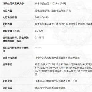 财经网生活讯 近日,财经网生活由信用中国获悉,绫致时装(天津)有限公司北京万丰路第二分公司因违反《中华人民共和国产品质量法》,被北京市丰台区市场监督管理局没收不合格商品,罚款7139元;没收违法所得1067.6元。