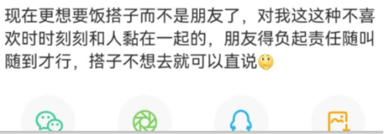 一方面,人们不是不爱社交了,只是在快节奏的生活中,寻找新的方式,来代替传统的社会关系。而“搭子”在这样的社交过程中,只是寻找真“朋友”的中间阶段。