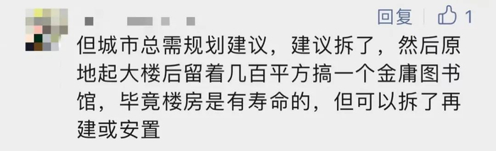 我们愿意相信,金庸图书馆的保留不是为了应付舆论,而是当地发自心底的认同、理解金庸图书馆的价值,理解文化建设的真义。可以想见的是,如果真的拆除,不管是对于当地的文化地标保护,还是对于喜欢金庸和热爱阅读的人来说,都是一个巨大的遗憾。