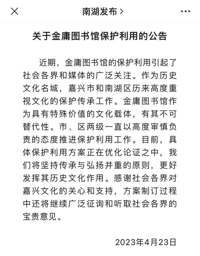 4月22日晚,公众号“六神磊磊读金庸”发文表示,浙江嘉兴的金庸图书馆即将被拆除,并上传了相关凭证。
