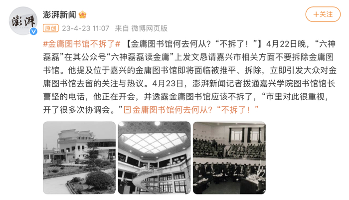而潮新闻记者从多方了解到,在“六神磊磊读金庸”发文前,嘉兴就已明确,金庸图书馆不拆了。