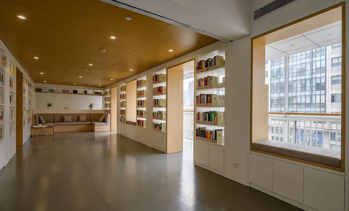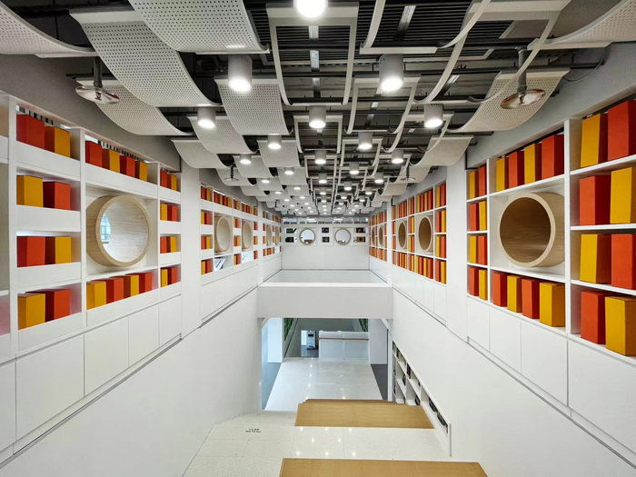 焕然一新的新馆总建筑面积3136平方米,共六层,外观造型采用折扇式穿孔铝板,远看像一本本书籍有序排列。内部三至五层区域设计为“全开放”“大空间”“无间隔”格局,在贯通的空间两侧,形成独一无二的“书墙”,读者可在书海中自由徜徉。