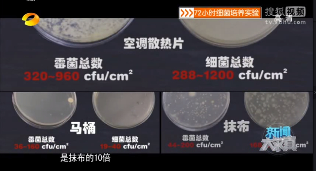 湖南卫视《新闻大求真》节目就对一台没有清洗过的空调进行过测试,结果发现:空调散热片的细菌含量是——马桶的60倍,是抹布的10倍!