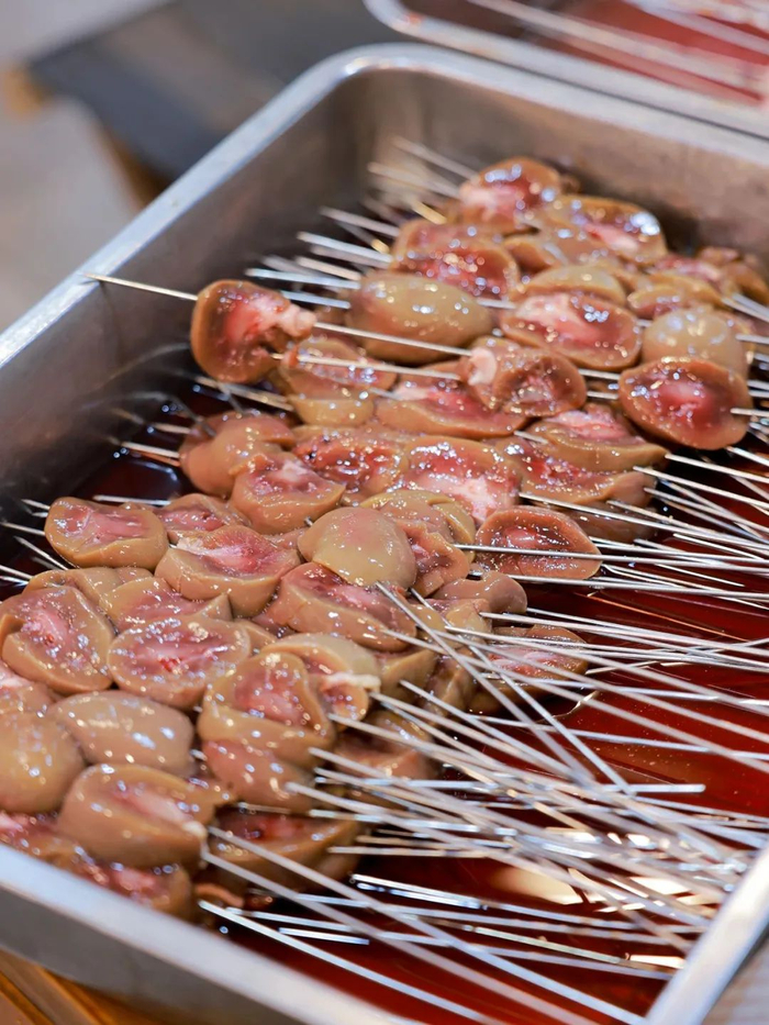 与油腰子相比,羊腰子更加考验大厨的“烤工”,新鲜的羊腰子放在火炉上,旺火烤制,大火烧脆外皮,炭火渗透内里,口感脆嫩,羊味道鲜香浓烈。