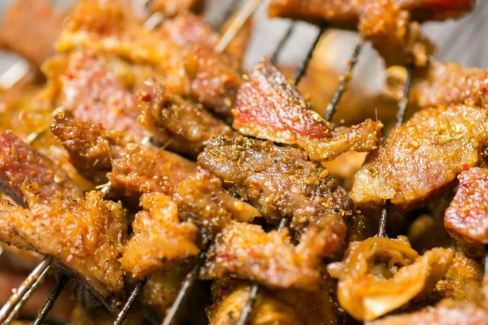 徐州烧烤多以羊肉为主,羊肉串、羊眼、羊腰、羊蹄筋、羊尾巴等等,只要你能想到的羊身上的部位,都能在徐州烧烤里找到。