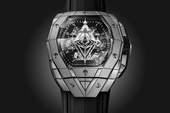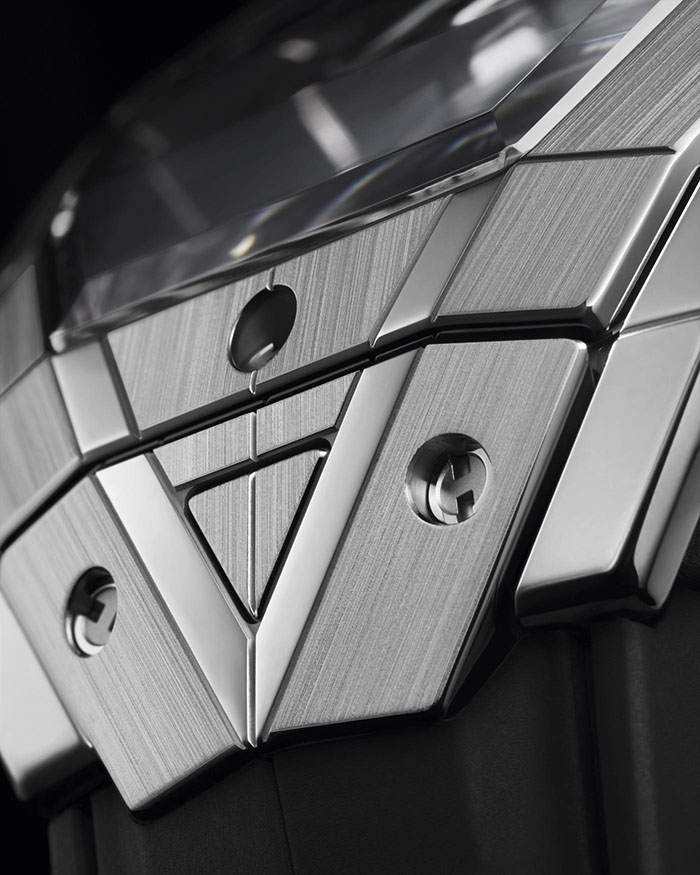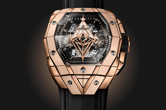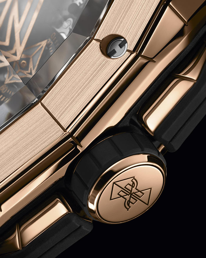 系列腕表采用多面结构设计,进一步增强了立体视觉效果。从表壳到表圈,几何刺青图案交替重叠呈现,圆盘指针亦采用了几何造型,这也是宇舶表与Sang Bleu刺青工作室合作款时计的标志性设计元素。
