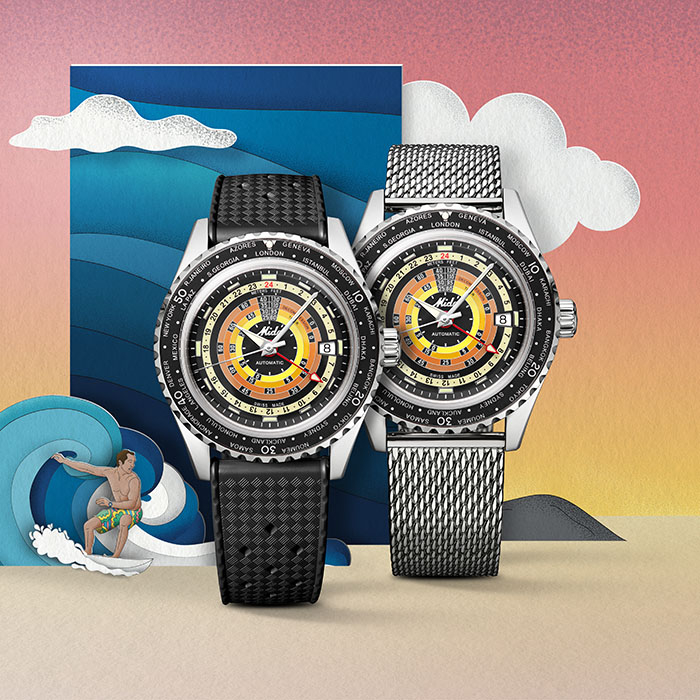 OCEAN STAR领航者系列“彩虹圈”腕表,延续原版的减压停留时间彩色显示功能和双时区功能,并在表圈配备世界时区显示功能。
