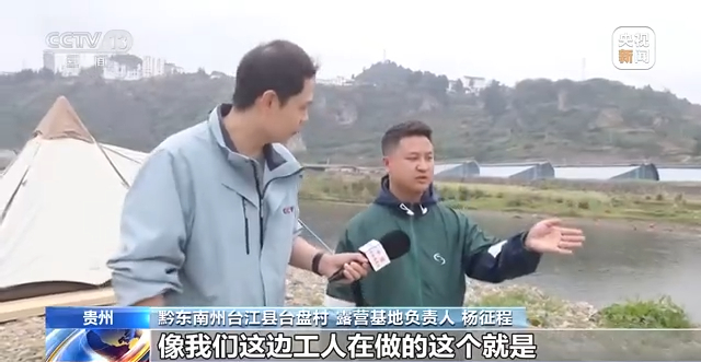 黔东南州台江县台盘村露营基地负责人杨征程:像我们这边工人在做的这个就是我们沿着河边的一个露营钓台,是给一些喜欢钓鱼的朋友过来住、来玩。然后我们现场还有很多帐篷,包括露营的,还有烧烤的,都有很多。