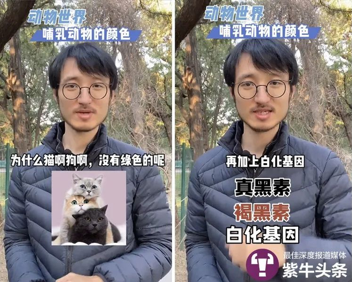 在近期的一个视频中,女儿问:“为什么哺乳动物没有绿色的?”郝博伟首先温柔地肯定了孩子通过自己观察得出的结论:“哺乳动物是真的没有见过绿色的”。然后,他从哺乳动物体内的色素和基因开始分析哺乳动物身上只可能出现的一些颜色,接着又从达尔文进化论角度讲述了变异的绿色基因会被物种在进化过程中淘汰。一个看似难以解答的问题就在他2分钟的娓娓道来之中被阐释清楚。