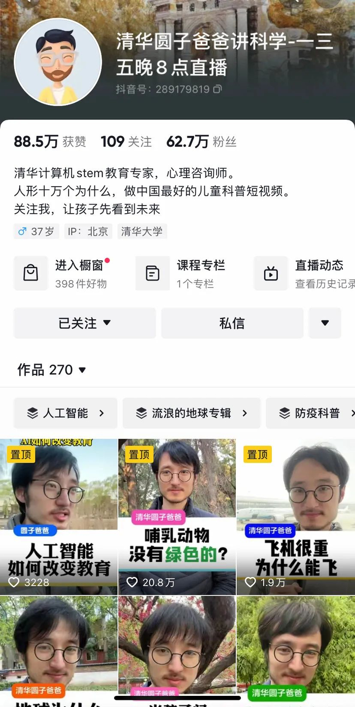 郝博伟的抖音账号@清华圆子爸爸讲科学如同短视频版的“十万个为什么”。从“动物的膝盖为什么是反的”到“花朵有没有绿色的”,从“太空中为什么会失重”“故宫为什么叫紫禁城”到“海洋为什么是蓝色的”,这些成年人已经习以为常,但在孩子眼中充满疑惑的问题,在他的视频中都能找到答案。