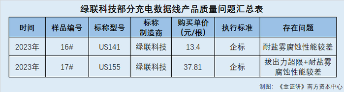据消费者协会公开信息,绿联科技制造的编号为16#、17#的样品,购买价格分别为13.4元/根、37.81元/根,购买渠道分别为京东、淘宝,执行标准均为企业标准。