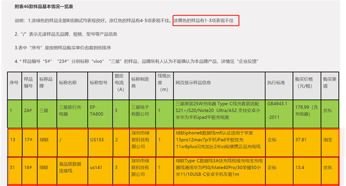 而与绿联科技上述两款产品被共同列示的,还有一款编号为24#的,标称厂商为三星电子有限公司的“三星旅行充电器”,执行标准为GB4943.1-2011。