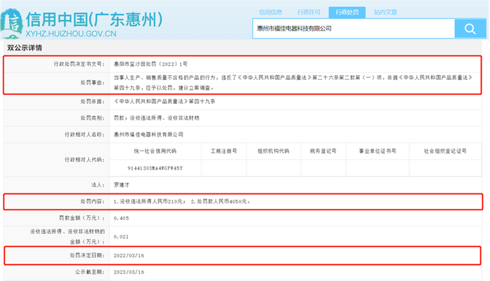 1.6 2022年惠州福佳再度出现不合格情形,因产品质量问题被罚款