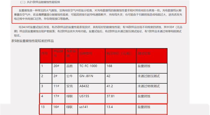 关于耐腐蚀性能弱:第三方抽查时,试验抽检时依据CQC实验室标准《CQC1333》测试(此标准属CQE实验室标准,非强制性标准),绿联依据国家标准《GB/T2423-17》测试合格,并送测第三方测试机构《GB/T2423-17》测试合格,我们的产品符合国标要求。”