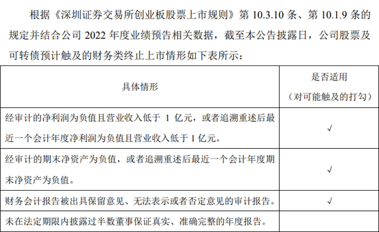 所谓规定情形包括,其股票交易被实施退市风险警示后,首个会计年度出现经审计的净利润为负值且营业收入低于1亿元,或者追溯重述后最近一个会计年度净利润为负值且营业收入低于1亿元;经审计的期末净资产为负值,或者追溯重述后最近一个会计年度期末净资产为负值;财务会计报告被出具保留意见、无法表示意见或者否定意见的审计报告。