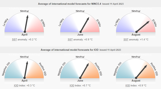 澳大利亚气象局4月11日表示,它调查过的所有七个模型,包括来自英国、日本和美国气象机构的模型,都显示到8月海面温度将会超过厄尔尼诺现象的阈值。该局表示,今年年底前发生厄尔尼诺现象的可能性为50%。但该局也指出,对南半球秋季的预测可靠性要低得多,应该“谨慎看待”。