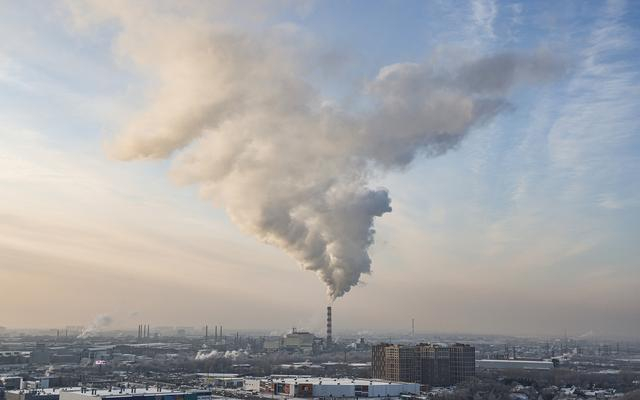 在俄罗斯新西伯利亚,工厂排放烟雾引发雾霾天气。