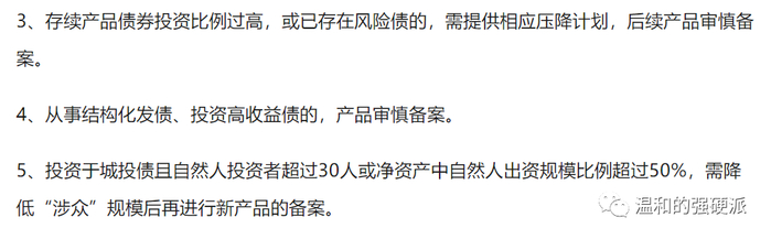 第三条,有风险的债券也别掖着藏着,及时暴露风险,防止风险积蓄,抓紧处理,处理不完风险你也别发行新产品了。