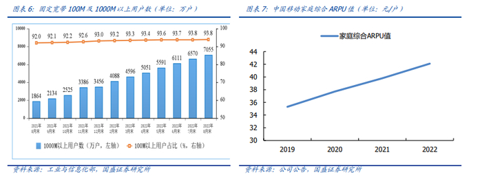 2022年,中国移动ARPU值企稳回升,提速降费基本结束,5G渗透率提升、红利逐渐体现。中国移动拥有三大运营商中数量最多的移动用户和宽带用户,随着人均收入大幅提升,提速降费成为过去式,有望打开提价空间、进一步扩大领先优势。同时,中国移动以“全千兆”策略为引领,全面推动智慧家庭服务升级,有望拉动家庭宽带综合ARPU提升。