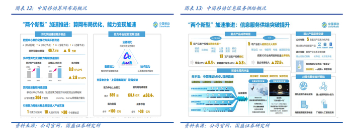 公司加快构建公众市场“算龙头”实现智能算力一点接入与即取即用。中国移动数据中心集约化梯次布局不断优化,多样性算力资源能力规模快速提升,引领算力网络从概念原型进入产业实践。2022年算力规模达8.0 EFLOPS,同比增加2.8 EFLOPS。