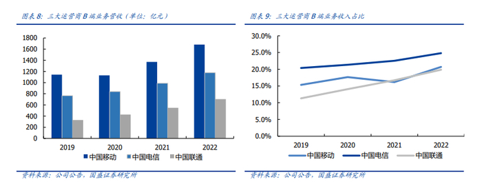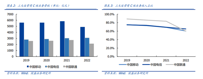 C端业务平稳运行,不存在降价风险。2022年,公司移动业务营收4888亿元,同比增长1.1%,移动用户ARPU值49.0元,同比继续上升。公司5G套餐客户渗透率达到63.0%,同比上升22.6%,公司移动业务延续了2020年以来的企稳回升态势,为公司提供了强大的业绩和利润支撑。从家庭市场来看,公司2022年家庭市场收入1166亿元,同比增长16%,其中智慧家庭增值业务收入297亿元,同比增长43.4%。运营商通过投资千兆宽带,换取更高的宽带月租并部署高附加值智慧家庭服务,正成为运营商C端增长的下一站。