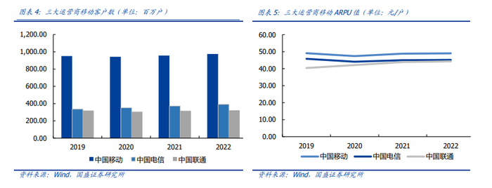 中国移动ARPU值位于3大运营商之首,5G助力移动ARPU值企稳回升。自2018年国务院提出“提速降费”的要求之后,公司的移动ARPU值一直承压。2022年与2023年政府工作报告中,未提及中小企业宽带和专线费用降费要求,“提速降费”基本结束。随着5G渗透率的上升与市场竞争趋缓,将利于公司移动ARPU值的提升。2022年移动用户ARPU值49.0元,同比继续上升。