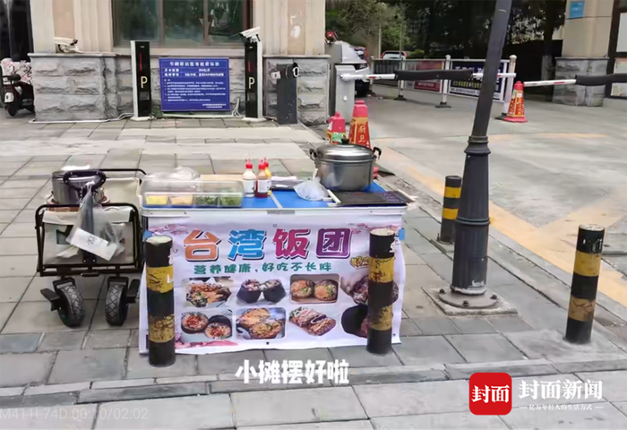 每天下午4点前备好货后,兰语文便拉着小推车,从租住地前往附近的小学门口。挂好摆摊布、将食物一一摆放好后,开始了小摊生意。“紫米饭团、狼牙土豆,五元一份!”