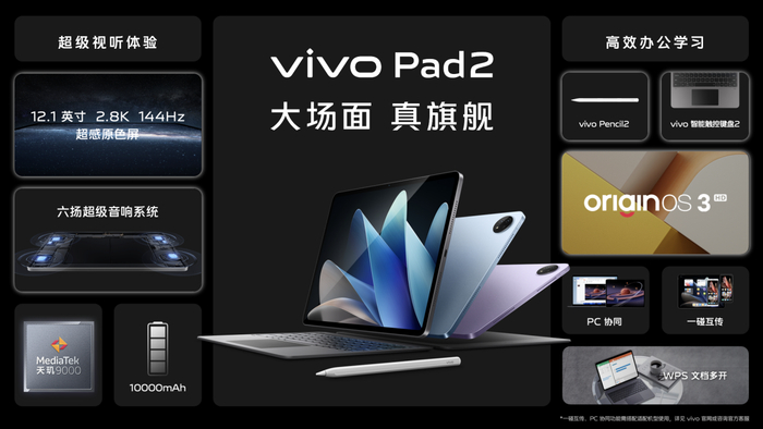 在高效办公方面,vivoPad2进一步升级了跨屏协同功能,不仅支持一碰投屏、传文件、接续任务,而且还能实现手机网络共享和来电信息同步等功能。更重要的是,升级的全新vivo办公套件,实现了vivoPad2与电脑共用一套键鼠,甚至还能完成平板远程控制PC的功能,随时轻松掌握高效办公。搭配全新的vivoPencil2、vivo智能触控键盘2和OriginOS3平板定制系统,实现更全面的跨屏协同,并支持WPS文档多开、手写原子笔记等功能,帮助用户更高效办公和学习。