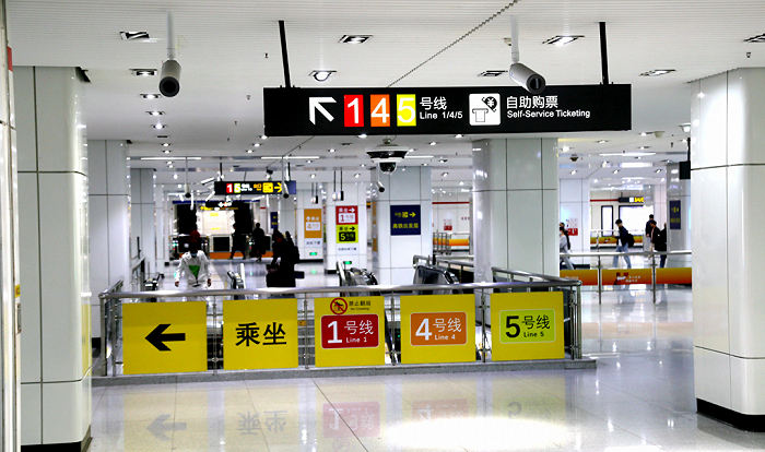 如果您要乘坐轨道交通,向南前行,能看到醒目的标识,下电梯进入地铁出发层。