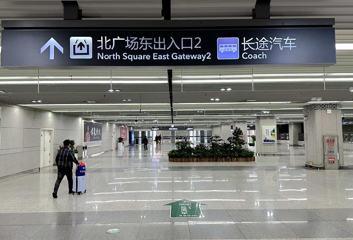 旅客从出站口向北,行至问讯处后,向着东出入口2的方向,一路前行至客运站,沿路均有标识指引。