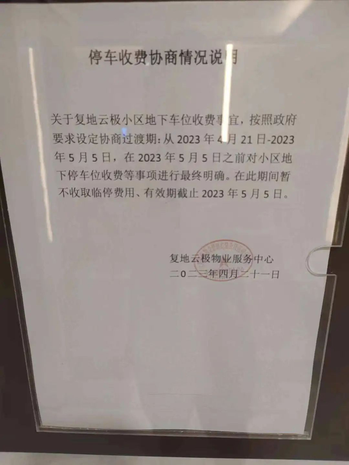 4月23日,复地云极一位业主向都市时报·大象房鉴所记者提供了一份《关于复地云极项目启动停车场收费工作的通知》。该通知于4月19日由复地云极物业服务中心发布,内容显示:复地云极项目启动收费时间为2023年4月20日,运管局备案审核收费标准为:车辆进场前30分钟内免费,30分钟后不足1小时,按1小时标准收取临时停放费用;车辆停放首小时5元,后每小时1元,当日累计24小时封顶28元;超过24小时的,以28元为底数累加计费。