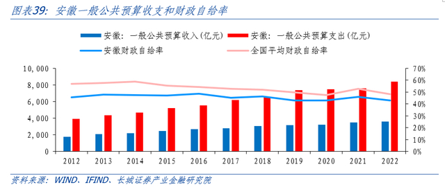 安徽省财政收入稳步增长,但财政自给能力较弱,对中央转移支付有一定的依赖。近十年,安徽省的一般公共收入由2012年1792亿元增加至2022年3589亿元,年均增长7.2%,高于全国的5.9%;一般公共预算支出则由3937亿元增加至8379亿元,年均增长7.8%。以一般公共预算收入占支出比例衡量财政自给率,安徽省财政自给率始终低于全国平均水平,且在2016年开始逐步降低,2022年财政自给率达近十年来最低点,为42.83%,财政自给能力相对较弱。
