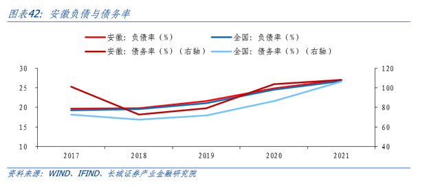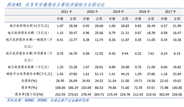 将城投债余额也纳入债务后,安徽省宽口径债务率低于全国平均水平。安徽省宽口径债务率从2017年的302.0%下降至2021年的252.59%,低于全国平均值273.63%,显示安徽省控制地方政府隐形债务有一定成效,近五年来首次低于全国平均值。