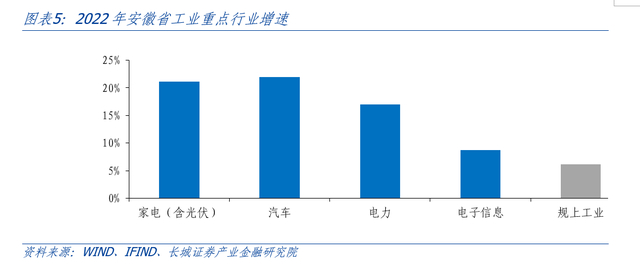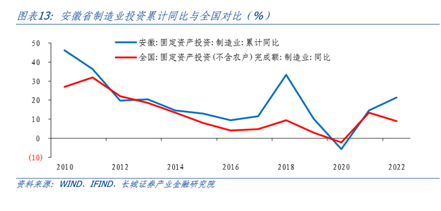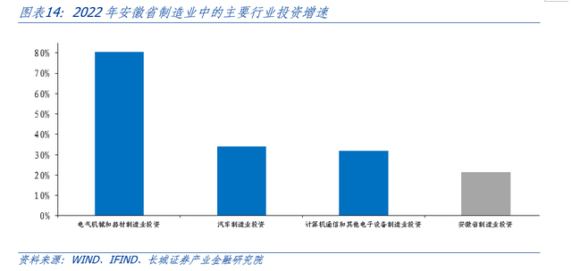 值得一提的是,近两年来安徽省制造业投资增速维持较高水平,为安徽建设制造强省奠定重要基础。2022年安徽省制造业投资增长21.5%,比全国增速高12.4个百分点。其中,2022年安徽省高技术制造业实现44.8%的增长;电气机械和器材制造业、汽车制造业、计算机通信和其他电子设备制造业投资同比分别增长80.5%、34.1%、31.9%。高增长的投资有效推动了相关行业增加值的增长,高技术制造业投资的高速增长助力安徽省制造业向高端化方向迈进。