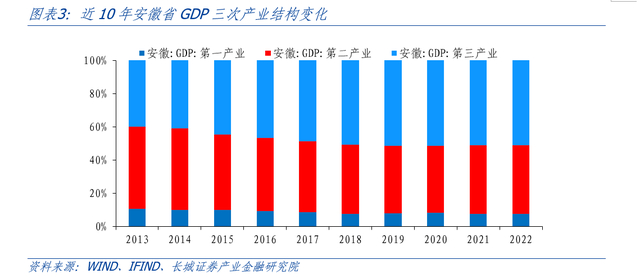 从横向对比角度来看,2022年安徽省三次产业占比为7.8:41.3:50.9,与全国三次产业比重的7.3:39.9:52.8相比,第一、二产业的占比相对较高;而从纵向时间维度看,安徽省三次产业占比从2013年的12.3:54.6:33.1逐渐调整为2022年的7.8:41.3:50.9,产业格局由“二三一”逐渐转变为“三二一”,第三产业占GDP比重逐渐上升。下文将分别对安徽第一、二、三产业进行详细分析。