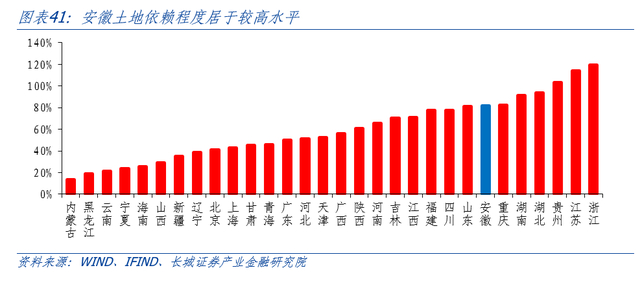 安徽省财政对土地的依赖程度处于相对较高水平。我们以成交土地出让金占地方公共财政收入的比例来近似衡量土地依赖程度,2021年安徽省的土地依赖度居全国各省市较高水平,事实上近10年以来其土地依赖度基本都高于30个省市的平均水平。