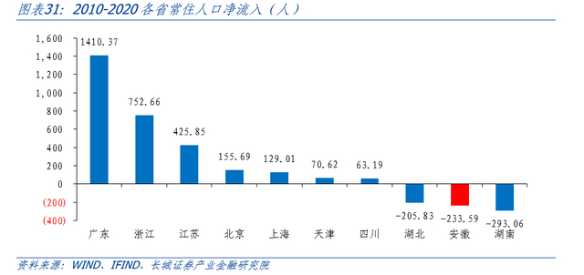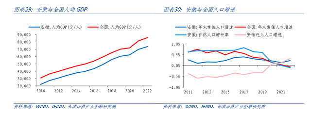 近十多年来安徽省人均GDP持续低于全国平均水平,对人口吸引力弱,2020年之前人口一直呈净流出趋势,近两年有所回流。按常住人口计算,2022年安徽省人均GDP为7.36万元,比全国水平低1.21万元。我们用第七次和第六次人口普查的常住人口差额,剔除这十年间安徽常住人口的自然增长来近似表示安徽省常住人口的净流入(出)情况,分析得出安徽2010-2020年常住人口净流出233.59万人,人口流失较多。安徽省流失的人口大量流向了浙江、上海等地。据浙江省统计局公布数据,截至2020年第七次人口普查时,安徽流入浙江的人口达313.9万人,安徽省是流入浙江人口最多的省份;上海市统计局公布的2022年人口变动情况抽样调查数据显示,2021年和2022年在沪外省市户籍常住人口分别有24.1%和23.2%来自安徽。2020年之后,安徽人口有所回流,迁入人口增速由负转正。2022年末全省常住人口6127万,与2020年七普的6103万人相比,共增加24万人,根据安徽省统计局表述,人口回流与近年省内就业机会增加和疫情影响有关,目前疫情影响减退,未来安徽要进一步吸引人口回流,加快产业转型和增加就业岗位是关键。