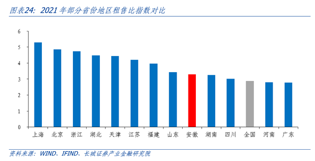 我们通过租售比指数(房价指数/房租指数)来刻画各省市租金和房价的比值在2001-2021年间的变化,可以看出,2021年安徽省租售比指数*高于全国平均水平,但低于江浙沪等地,说明相较于全国平均水平来说,安徽省房价增速快于房租涨幅。[2]