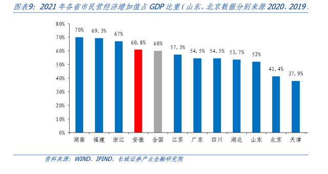 安徽省民营经济活跃度较高,对经济发展的拉动作用明显。据安徽省经济和信息化厅于2021年10月19日召开的新闻发布会介绍,2020年安徽省民营经济实现增加值2.3万亿元,增速达3.6%;民营经济呈现出“66789”的特征,具体来说,安徽省民营经济贡献了全省60.6%的GDP、68.1%的税收、70%以上的创新成果、80%以上的城镇新增就业以及90%以上的企业数量。2021年安徽省民营经济进一步发展,全省民营经济增加值升至2.6万亿元,占全省GDP的比重进一步提高至60.8%,略高于全国平均水平;民营经济对全省经济增长的贡献率达到63.5%;民营经济市场主体超过了700万户,增长91.3%。未来安徽省也将持续促进民营经济蓬勃发展,《安徽省“十四五”中小企业发展规划》提出的目标指出,到2025年末,安徽省民营经济增加值占GDP比重要保持在60%以上,民营经济对GDP增长的贡献率保持在60%以上。
