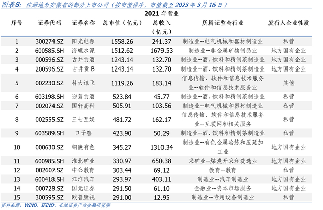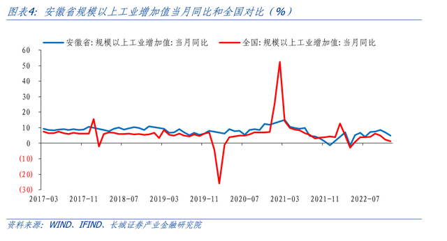 安徽省工业发展稳中向好,优势行业较快发展推动产业结构不断优化。从总量角度来看,2022年安徽省规模以上工业增加值同比增长6.1%,工业增加值占GDP比重达到30.6%,较上年提升了0.5个百分点;其中制造业增加值同比增长5.6%,占GDP比重为26.5%,比上年增加了0.3个百分点。今年1-2月安徽工业经济也保持了良好发展态势,规上工业增加值同比增长5.1%,比全国平均水平高2.7个百分点;其中制造业增加值同比增长6%,比全国水平高3.9个百分点。从产业角度来看,安徽高技术新兴产业增势良好。2022年安徽省高技术制造业增加值同比增长10.3%,占规上工业增加值比重从上年的13.6%提升至14.2%,对全省规上工业增加值的贡献率达23.2%;装备制造业增加值增长12.8%,占比由上年的33.8%提高到35.2%,为规上工业增加值贡献了69.9%的增长,产业结构实现进一步优化。从产品角度来看,安徽工业新产品产量实现较快增长。2022年安徽光纤产量增长23.6倍,集成电路、新能源汽车、太阳能电池(光伏电池)产量分别增长了100.5%、67.5%和33.6%。