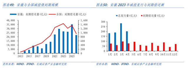 2017年至2022年,全国和安徽城投债票面利率处于持续下滑态势,2023年均有所回升,整体变动趋势相似。2022 年全国城投债票面利率为3.81%,较 2017 年下滑 186BP,安徽省城投债票面利率3.54%,较2017年下滑215BP,低于全国27BP,发行成本明显下降,2023年,安徽和全国城投票面利率分别上行101/59bp,融资成本上升。