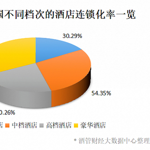 同时,不同档次的酒店,连锁化率也不尽相同。经济型酒店连锁化率为30.29%,低于中档酒店的54.35%、高档酒店的40.26%、豪华酒店的60.39%,也低于整个酒店行业的39%。